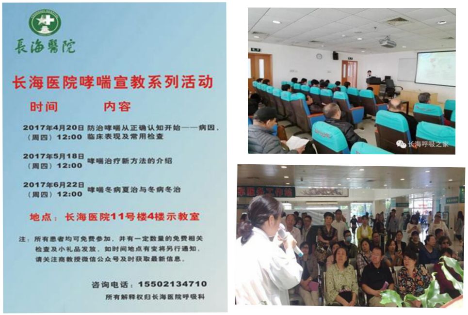 5.为配合2017年5月2日哮喘日健康教育活动,上海长海医院呼吸内科先后举办了3次“哮喘健康知识普及”的系列讲座。内容包括“防治哮喘从正确认知开展---病因、临床表现及常用检查”、“哮喘防治新方法的介绍”、“哮喘冬病夏治与冬病冬治”等。讲座的主讲人是呼吸内科商艳教授,参加活动的患者有30到50多人,讲座结束后,商教授耐心详细地回答了现场病友提出的各种问题,发放哮喘日记及峰流速仪,并为患者进行了免费的肺功能及一氧化氮检测。广大患者踊跃参加哮喘日举办的系列活动,更新了对疾病的认识,收获巨大。