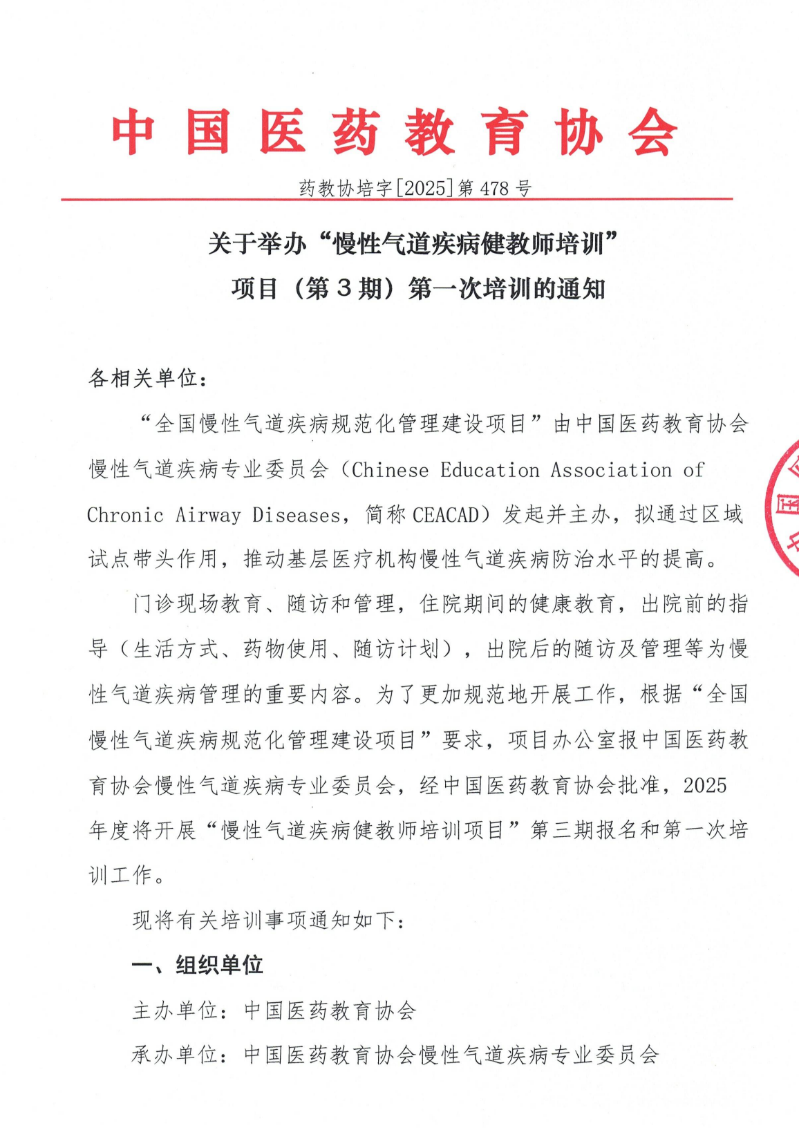 药教协培字478号--关于“慢性气道疾病健教师培训”项目(第3期)第一次培训的通知
