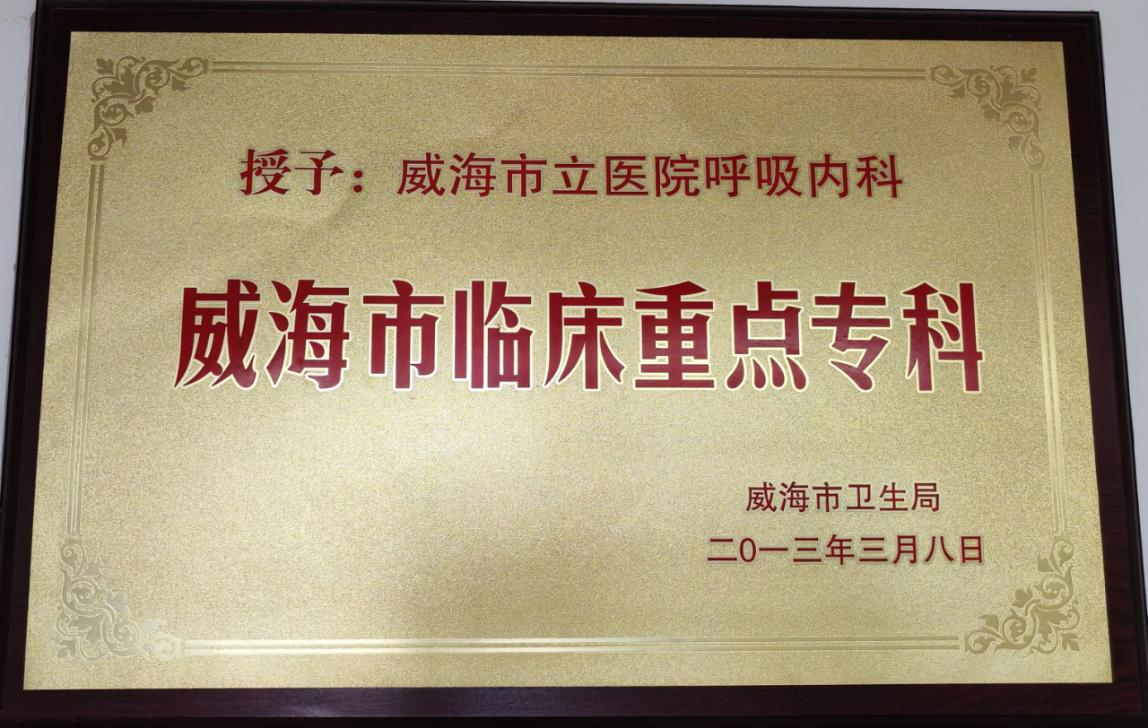 威海市立医院呼吸与危重症医学科是集医疗、教学、科研为一体,门诊病房统一管理的独立临床科室。科室自2004年独立成科,2012年被评为全省首批护理服务示范病房,2013年评为威海市临床重点专科,2017年成为国家呼吸临床研究中心中日医院呼吸专科医联体,2018年通过国家呼吸与危重症医学科(PCCM)学科评审,同年成为国家呼吸临床研究中心危重症协作组成员单位,2019年成为国家呼吸临床研究中心慢阻肺康复协作组成员,2020年成为威海市呼吸内科质控中心挂靠单位、中国肺癌防治联盟肺结节诊疗分中心,同年评为山东省专科护士培训基地、中华护理学会京外呼吸专科护士培训基地,2021年成为山东省呼吸区域医疗中心呼吸专科医联体,2023年成为国家心血管病中心肺动脉高压专科联盟成员单位、威海市呼吸系统疾病临床研究中心建设单位,2024年11月份成为全国第52家慢性气道疾病规范化管理项目建设单位。