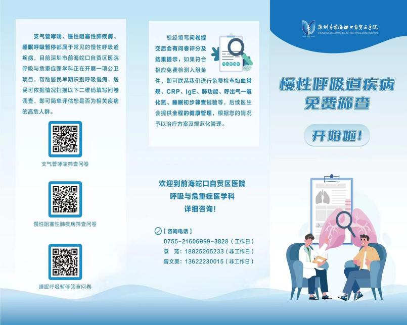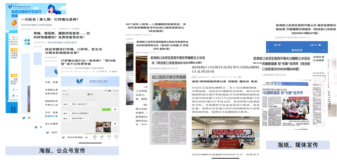 科室连续两年开展公卫项目,免费帮助呼吸慢病早诊早筛。2023年开展公卫项目《阻塞性睡眠呼吸暂停综合征高危人群筛查及分层管理》,通过互联网问卷或调查纸质问卷,共收集深圳18岁以上居民OSA筛查问卷5707份,其中筛选出OSA高危患者1355人,为467人建立了个人档案并免费进行睡眠呼吸初步筛查,357人最终被确诊为OSA。