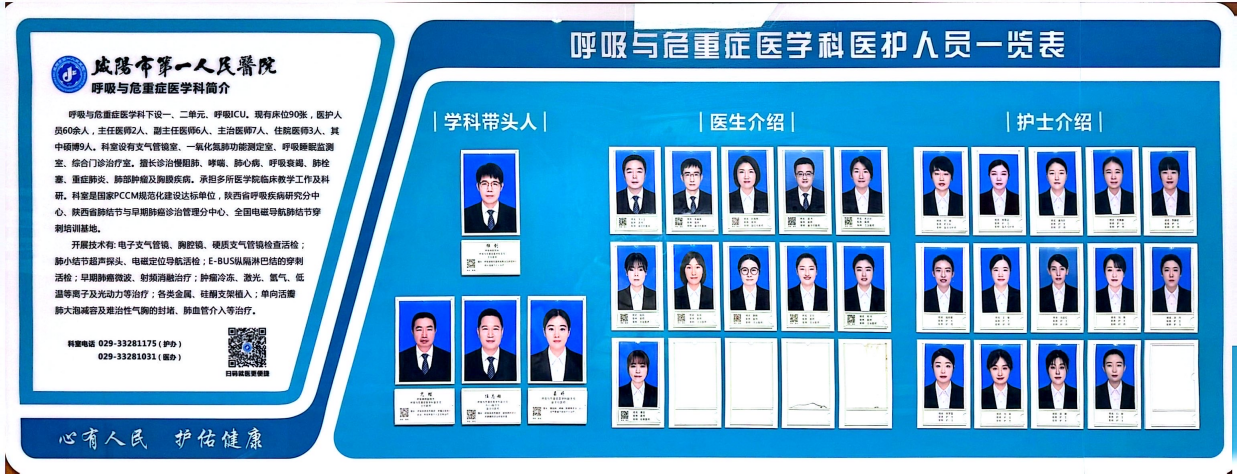 咸阳市第一人民医院呼吸与危重症医学科下设一、二单元、呼吸ICU。现有床位90张,医护人员60余人,主任医师2人、副主任医师6人、主治医师7人、住院医师3人、其中硕博9人。