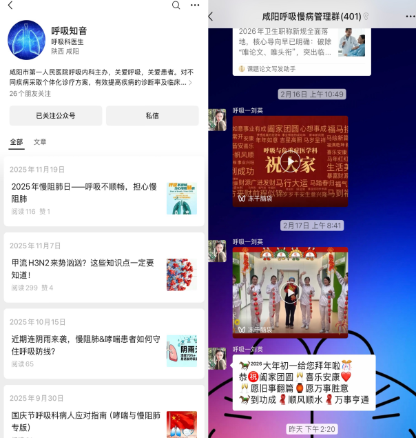 定期为患者开展吸入装置规范使用指导、肺功能康复训练指导,通过一对一宣教、现场演示、健康讲座等形式,提升患者疾病认知与自我管理能力。依托微信群、公众号、抖音、视频号等新媒体平台,持续推送慢病防治知识、康复要点与用药提醒,构建线上线下一体化慢病管理模式,切实改善患者生活质量。