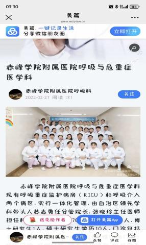 赤峰学院附属医院呼吸与危重症医学科二病区(RICU),前身为2004年成立的赤峰学院附属医院呼吸内科,是赤峰市医药卫生学会第一届呼吸专业委员会主任委员单位。2018年成功通过国家呼吸与危重症医学科(PCCM)规范化建设评审。科室现有医护人员31人,其中医生 9名,护师22名,其中主任医师2名,副主任医师1名,硕士研究生8名,主任护师1人,副主任护师4名,主管护师7名。科室长年承担赤峰学院临床医学院、包头医学院理论及临床实践教学任务、研究生及规培医生、进修医生带教工作。